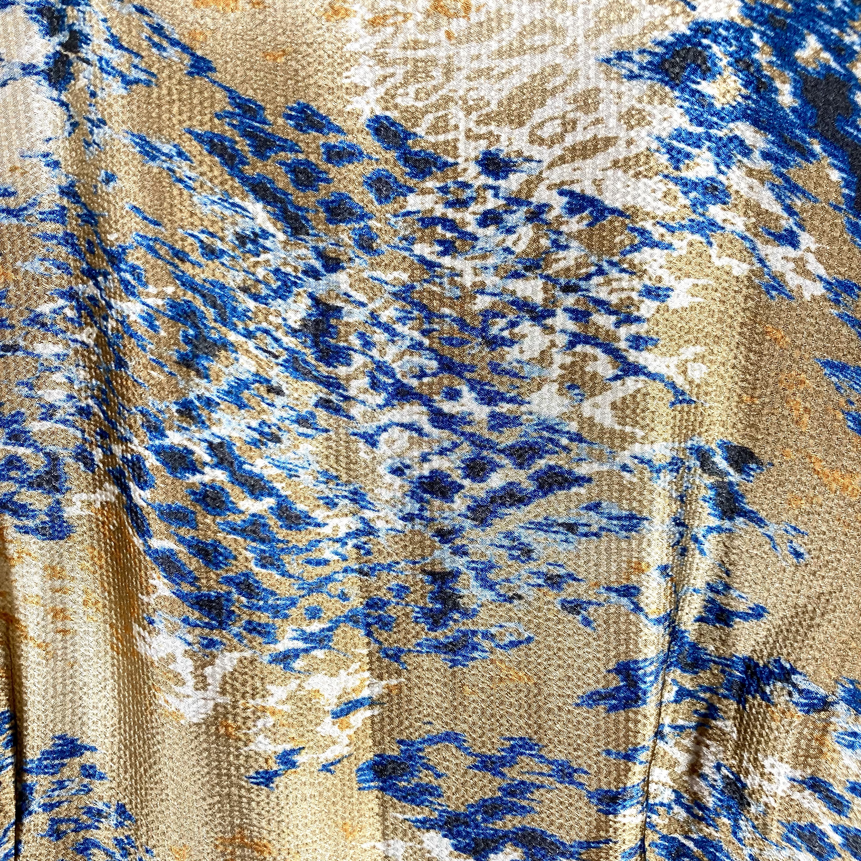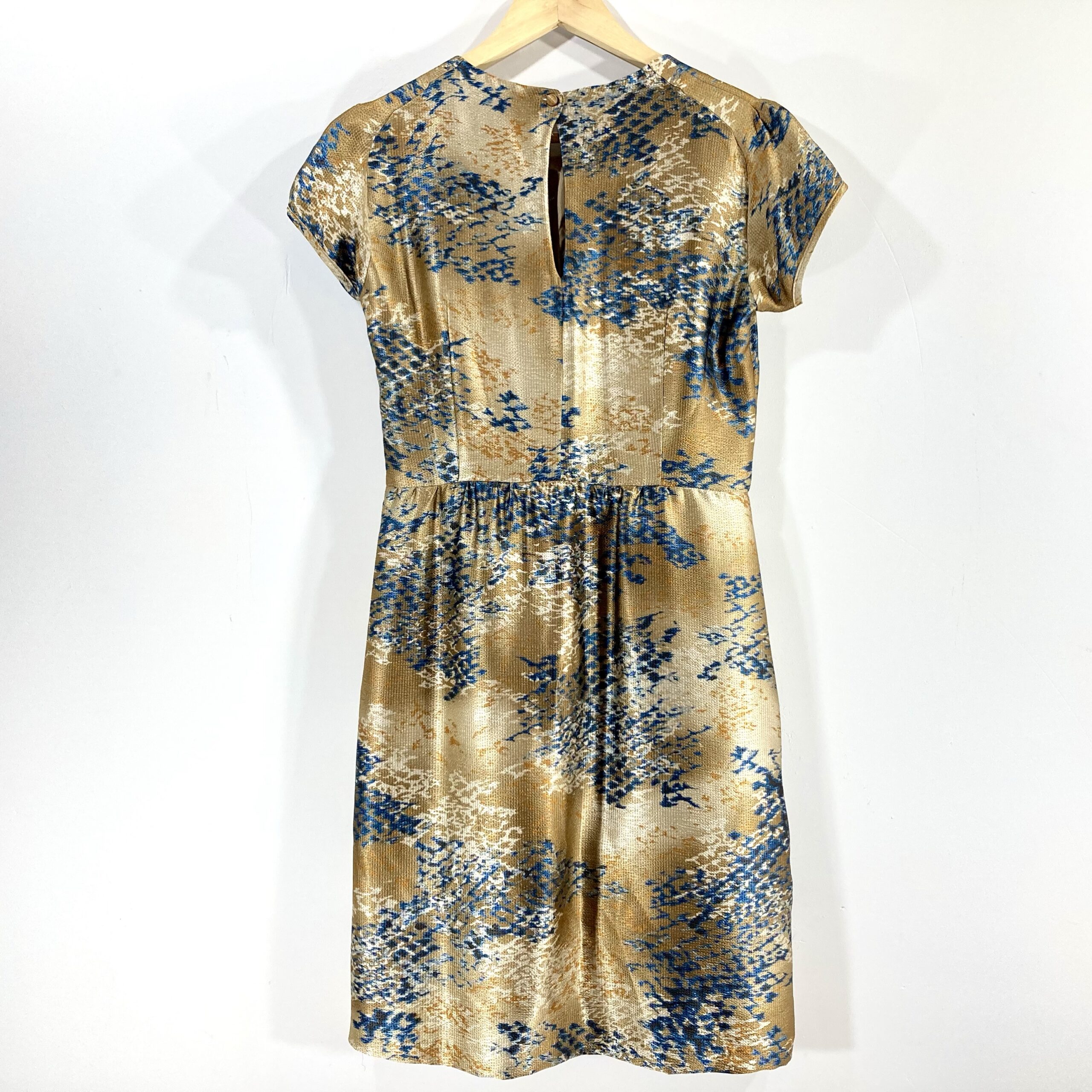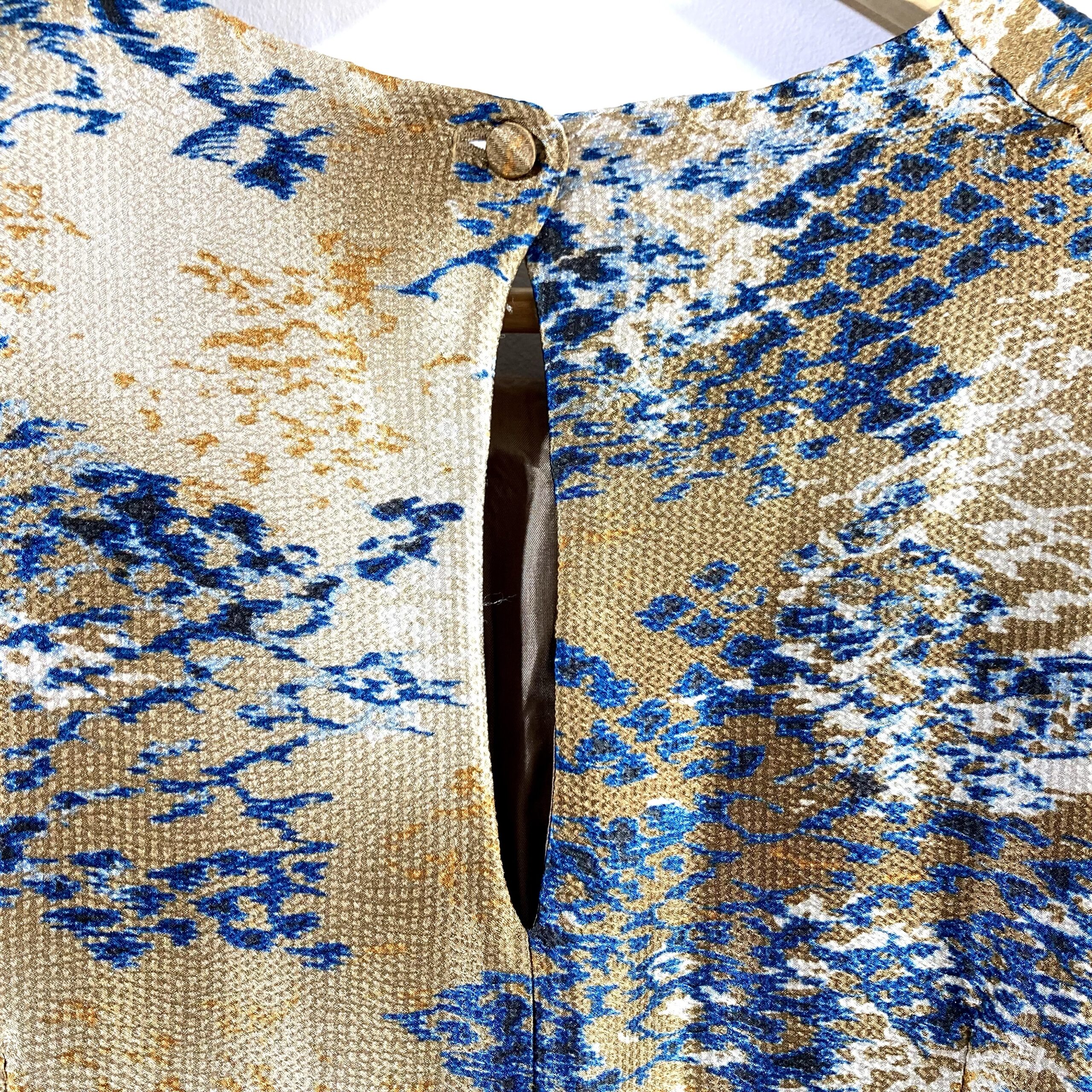 Beautiful abstract print midi dress by Style Benetton in a light crape like fabric. The gold dress features an abstract print of blue and white reminiscent of Asian wood block print. A keyhole back with a single button fastening. Cap sleeves.
