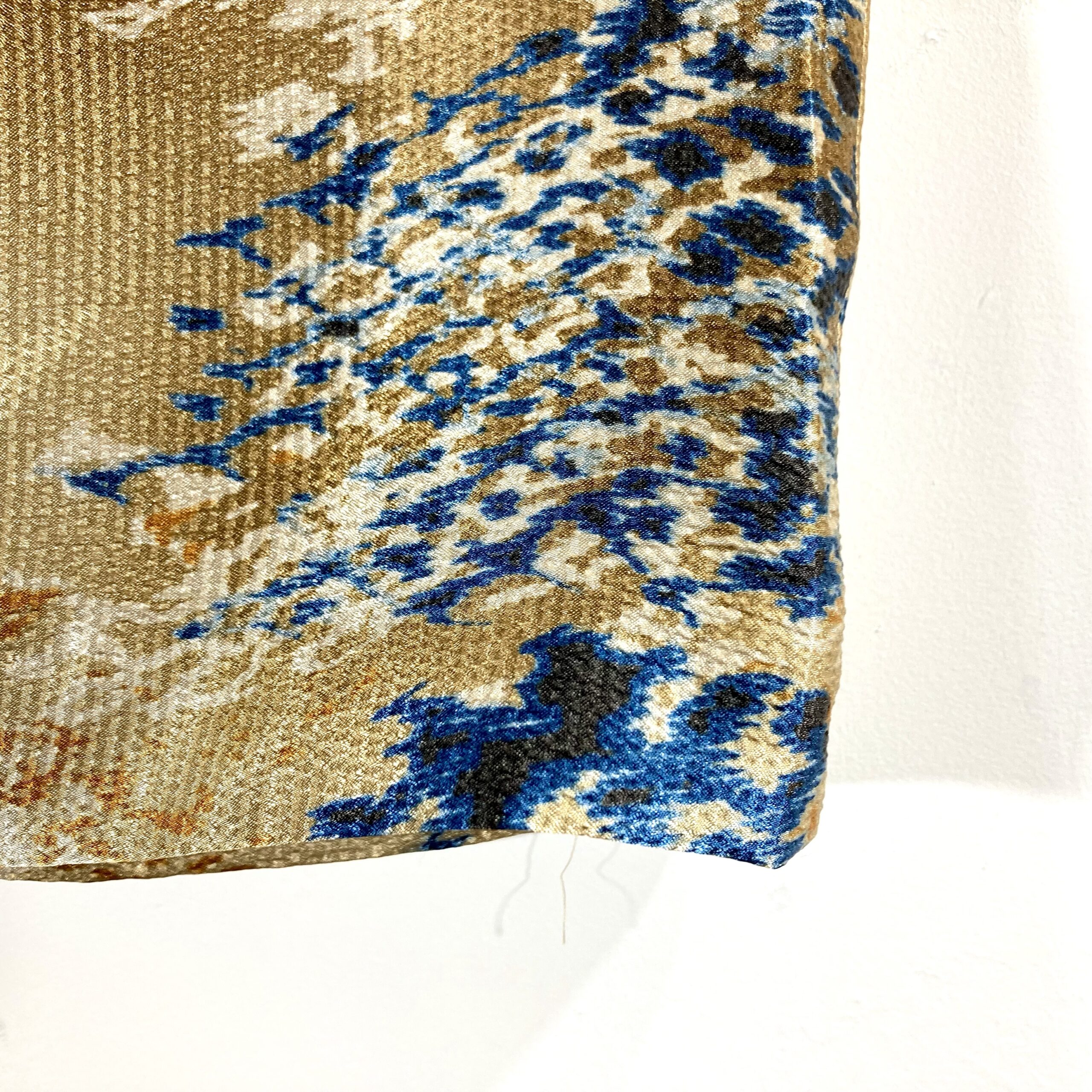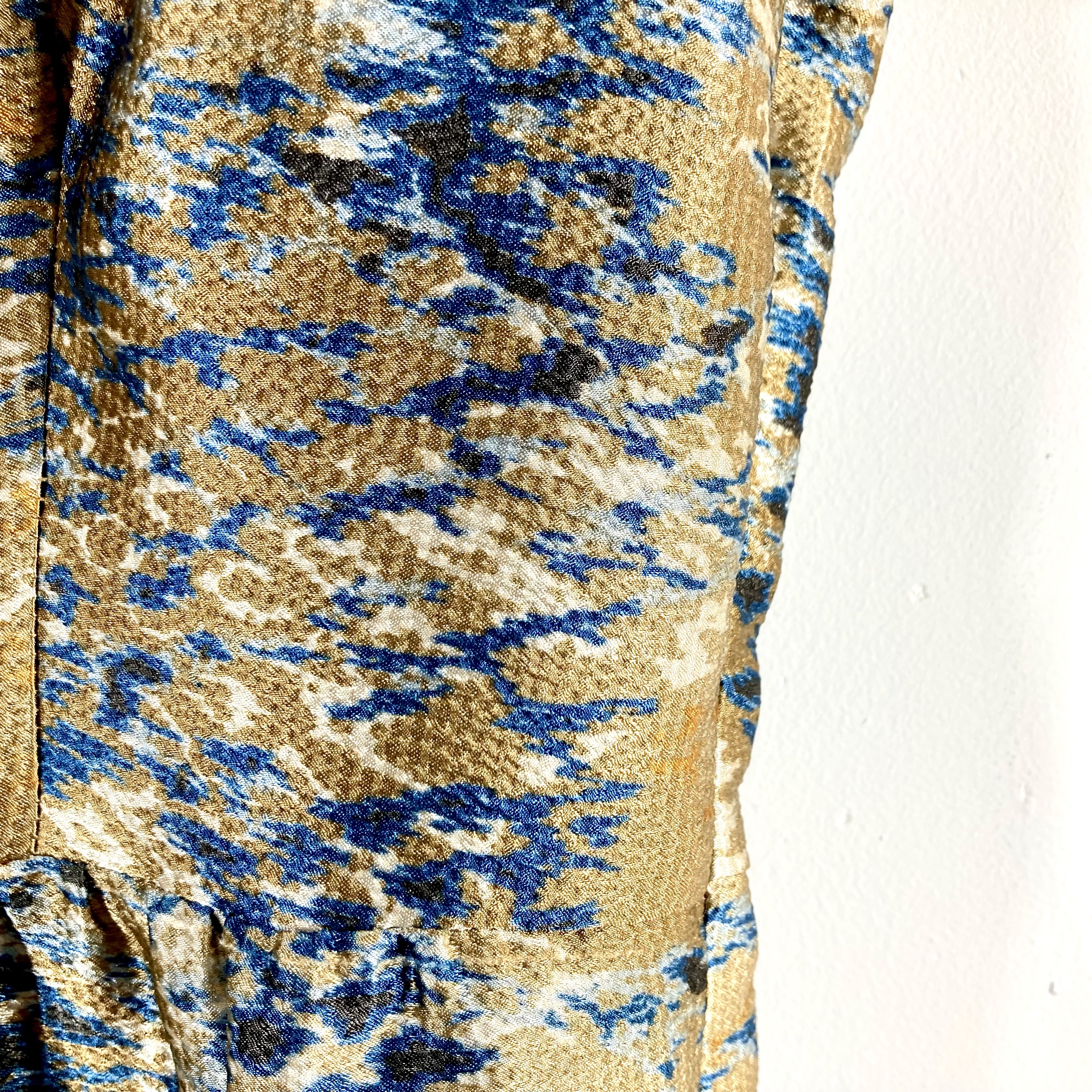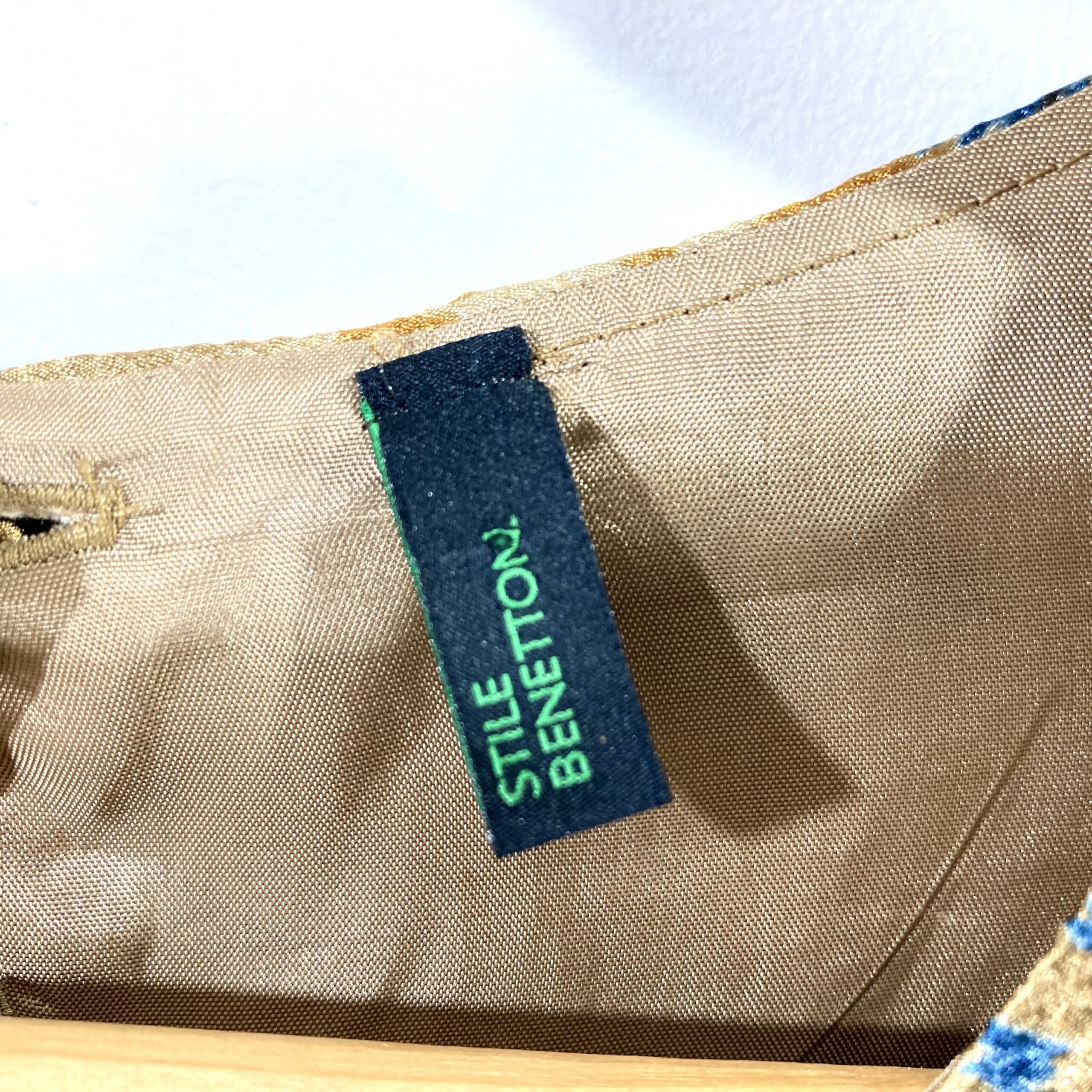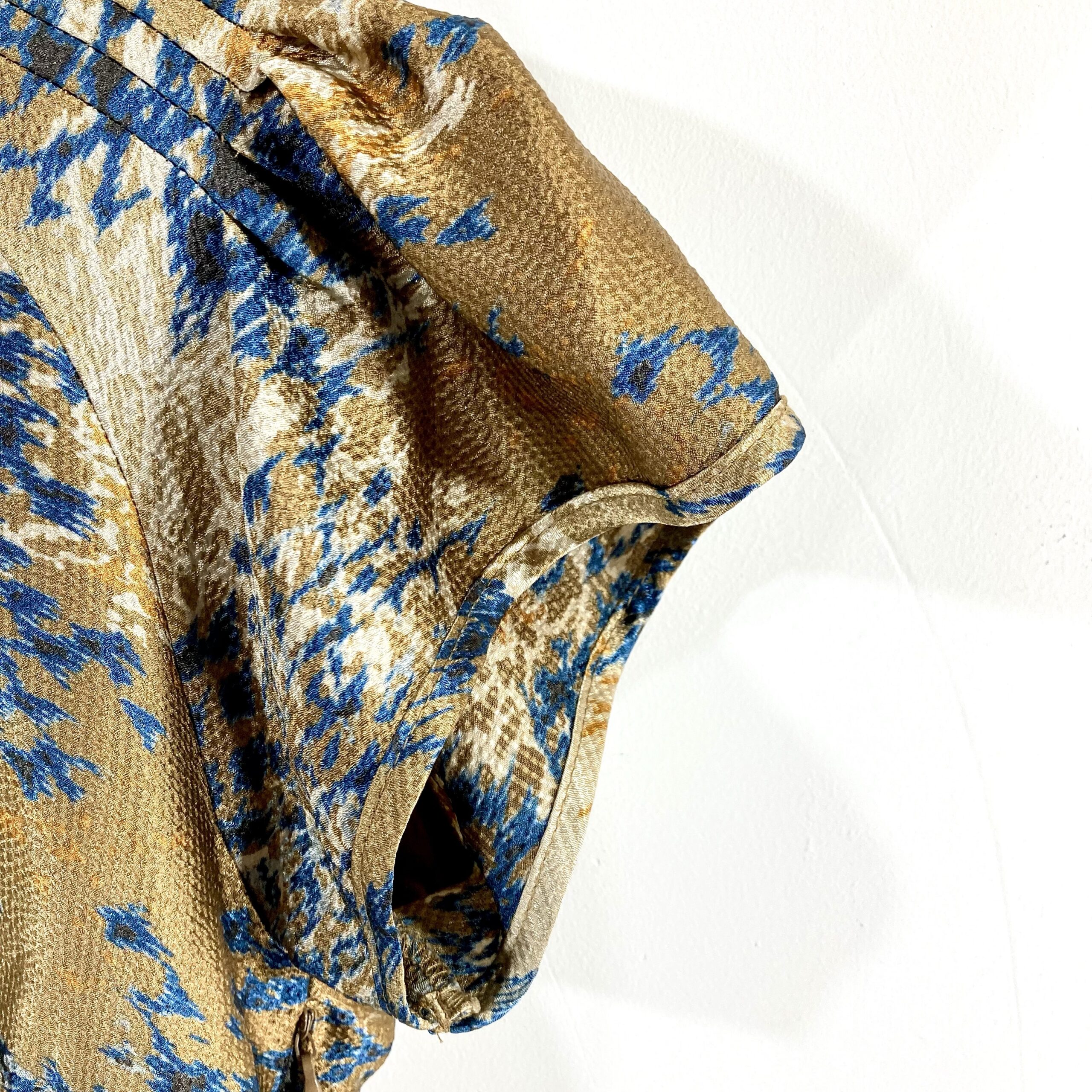 Beautiful abstract print midi dress by Style Benetton in a light crape like fabric. The gold dress features an abstract print of blue and white reminiscent of Asian wood block print. A keyhole back with a single button fastening. Cap sleeves.