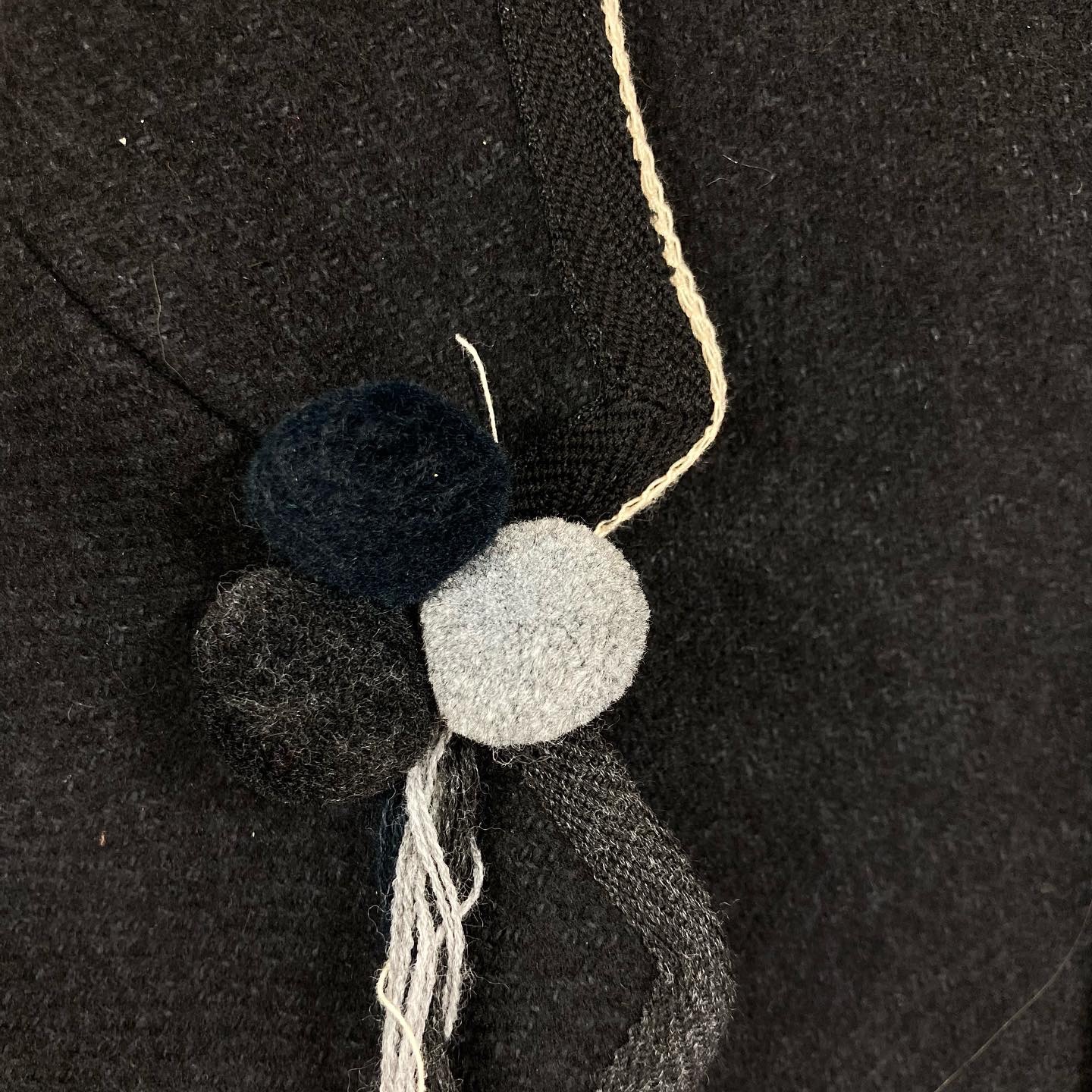 Beautiful quality blazer, by High Use, in grey Wool. The blazer is made from a heavy weight wool with lighter grey trim. it has a unusual cropped design, single breasted with two buttons, with full length sleeves that are turned up at the cuff. It features a pom-pom detail on the lapel. Fully lined in a striped fabric. Incredible quality throughout.