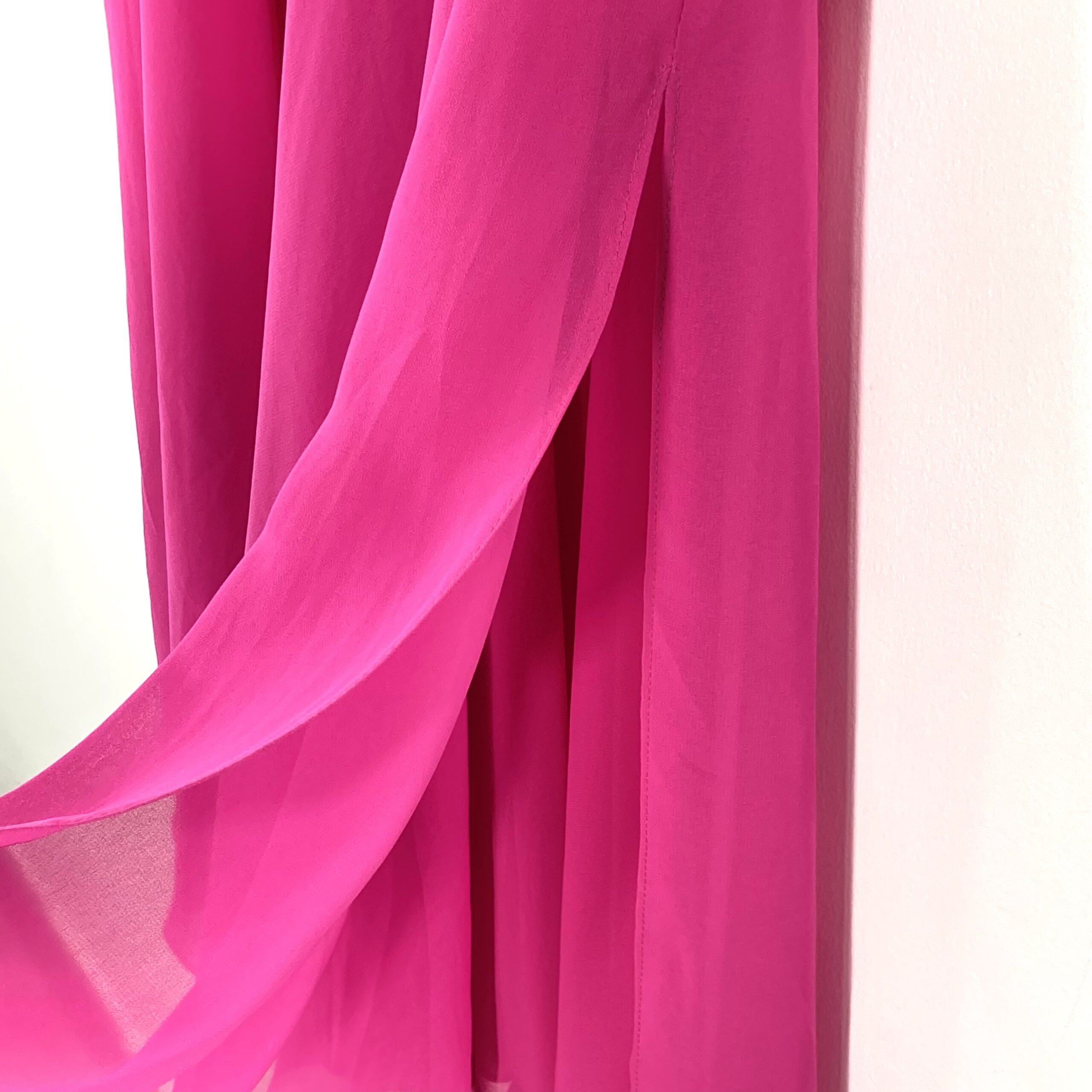 Bright and bold sheer maxi skirt by Topshop in bright pink sheer fabric. The maxi skirt is sheer with a solid Mini underskirt for modesty, and is slitted high on both sides.