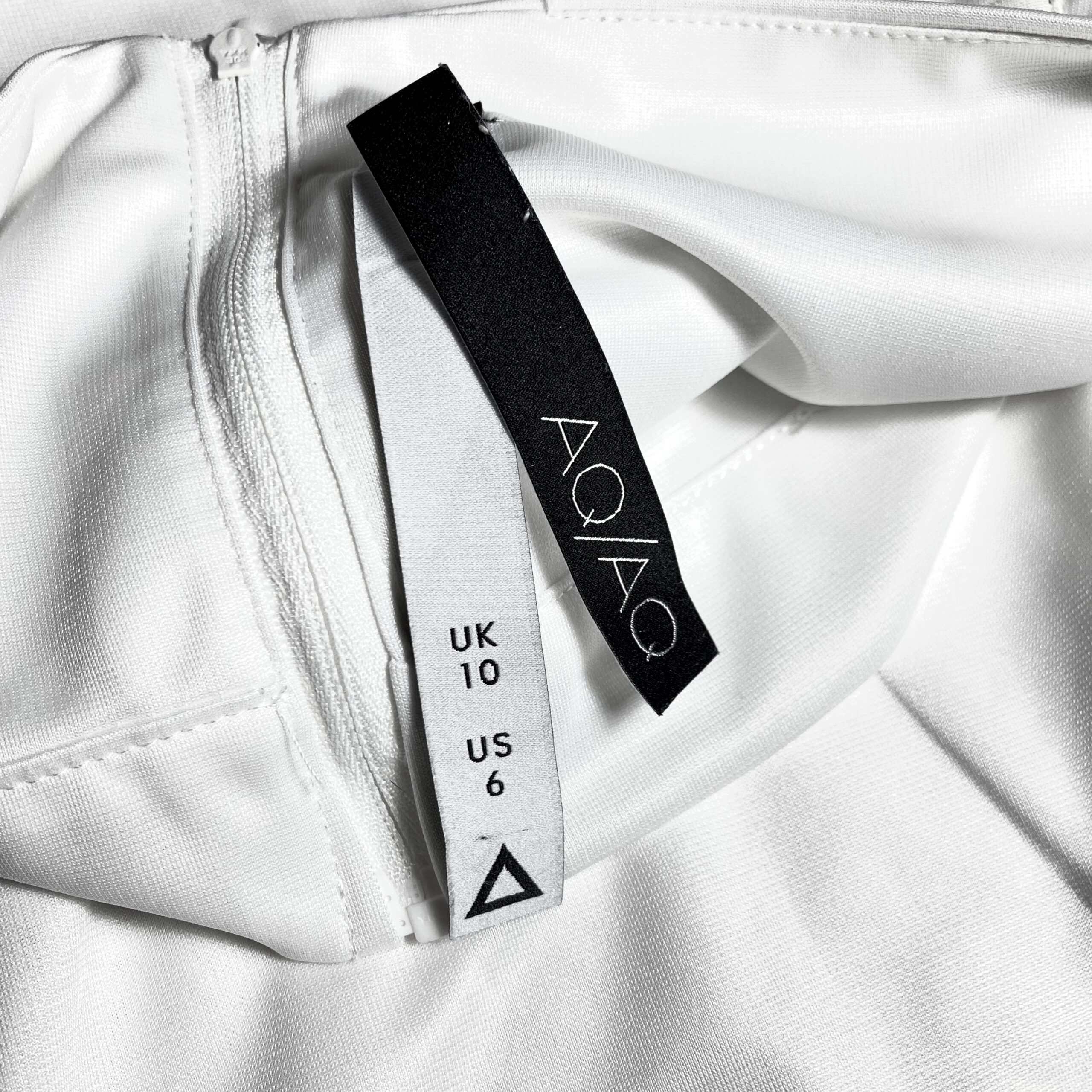 Beautiful Crop Top, by AQ/AQ, in a mid weight white Fabric. The Top features a cut out section on the front and a halter style neck that fastens with buttons and an open back.