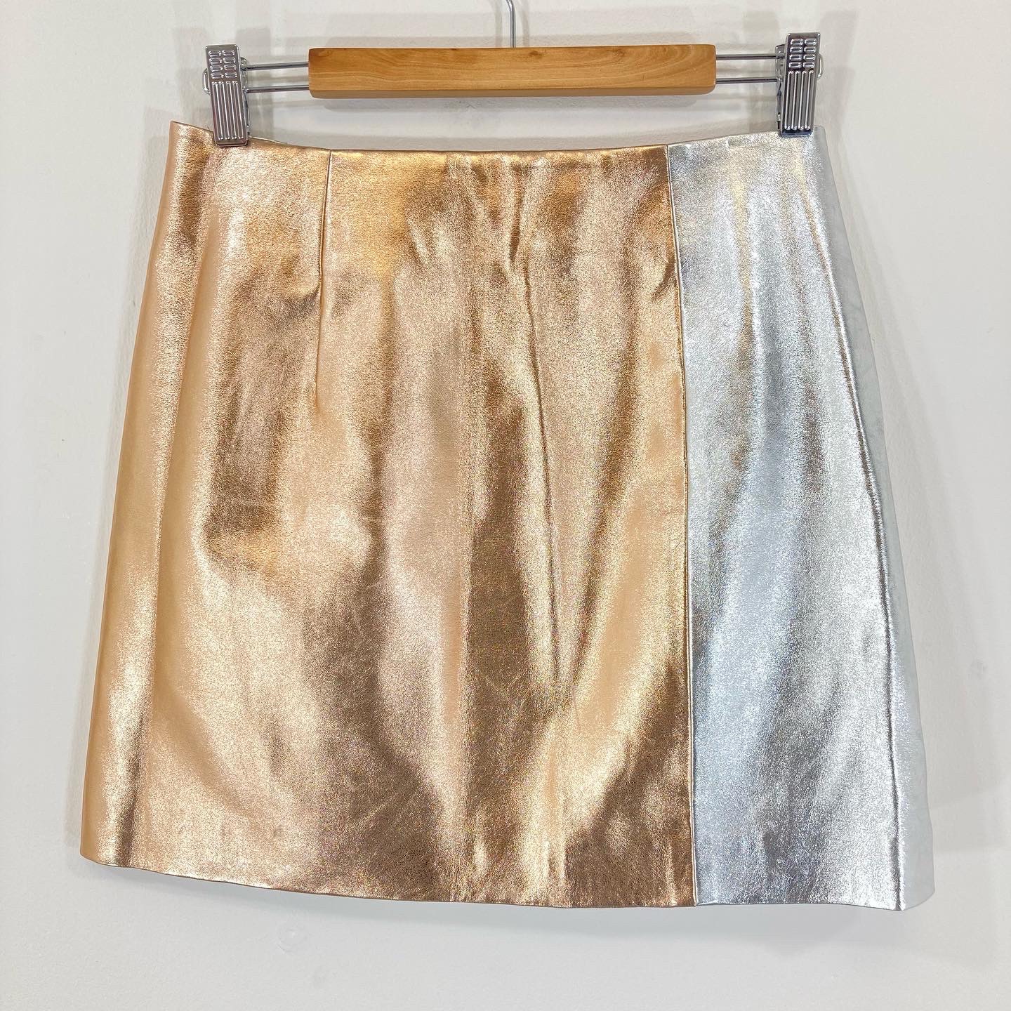 Striking faux leather mini skirt by French Connection in a lovely Gold and Silver faux Leather fabric. The skirt has gos an silver panels with a full length zip that opens from both sides, allowing the skirt to be worn with a split of any length.