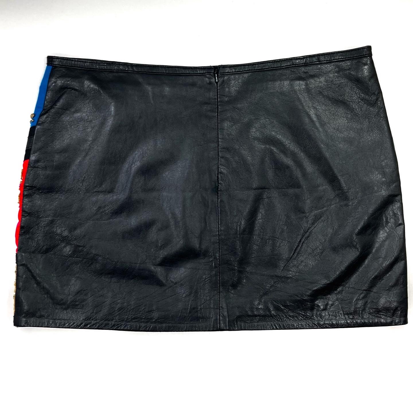 Unusual faux Leather skirt by River in soft faux leather. The skirt features six colourful beaded panels, each panel is a different colour and features a different style of Indian bead work and embroiderie.