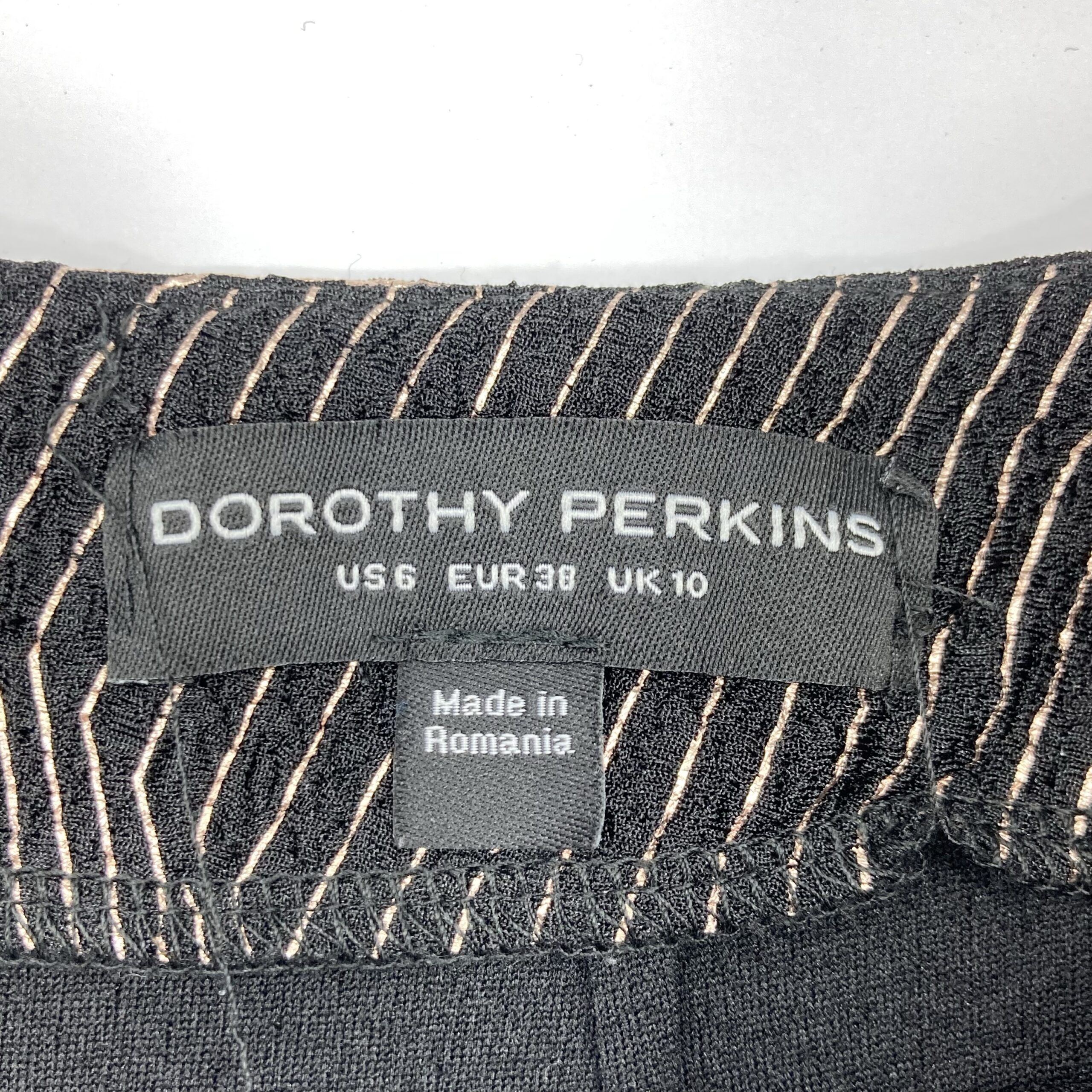 Stunning geometric print skirt by Dorothy Perkins in a medium weight black fabric. The skirt features a bold gold geometric print. The fabric has a little stretch in it.