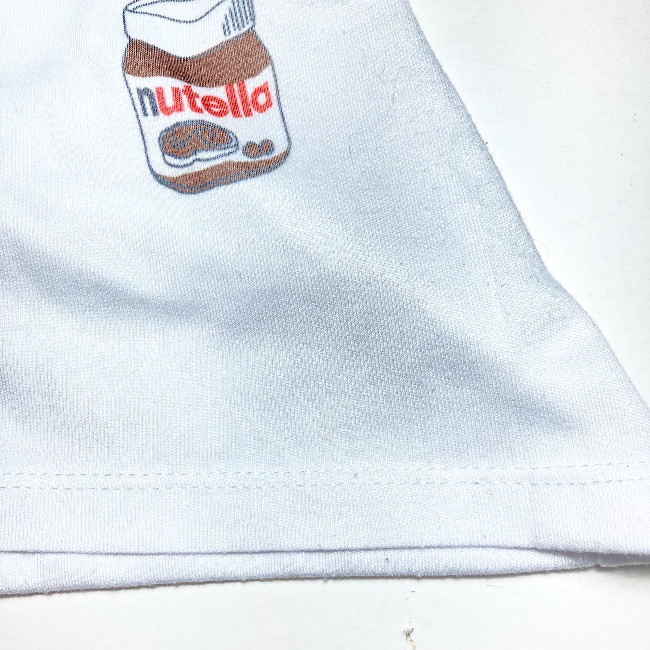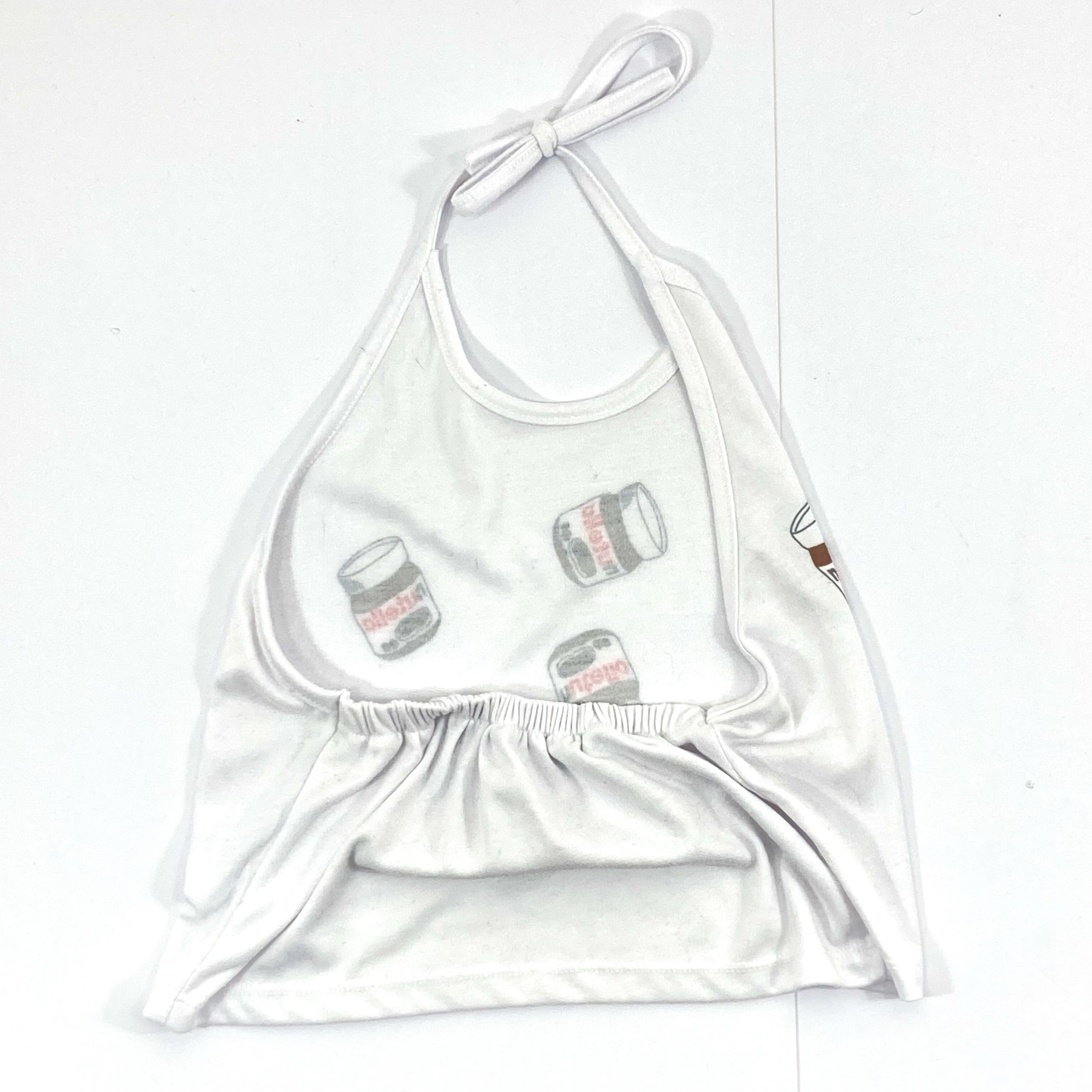 Vintage style Printed Vest Top, in a lightweight white cotton Fabric. The Top features a Nutella jar print, that ties at the neck in a halter neck style with an exposed back.