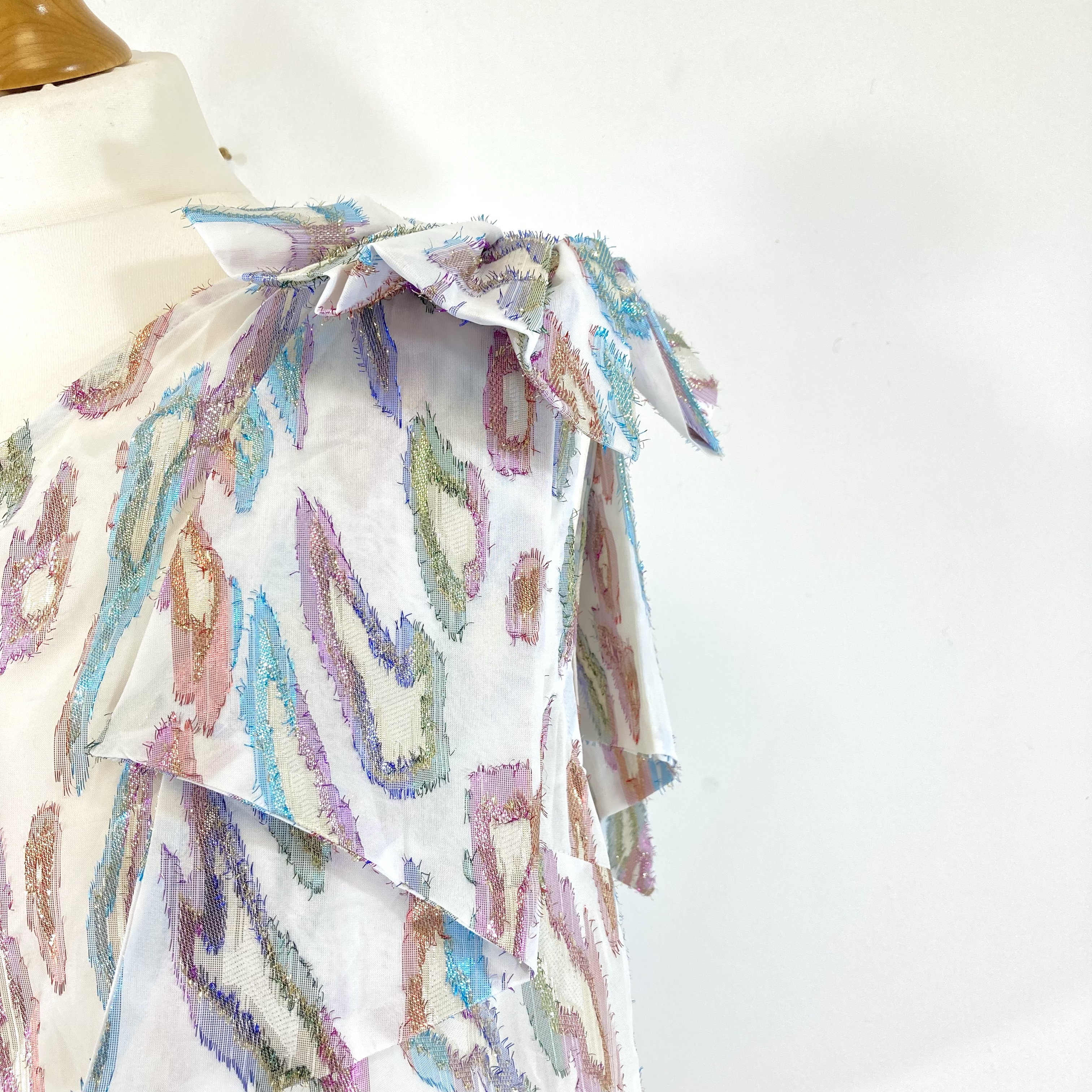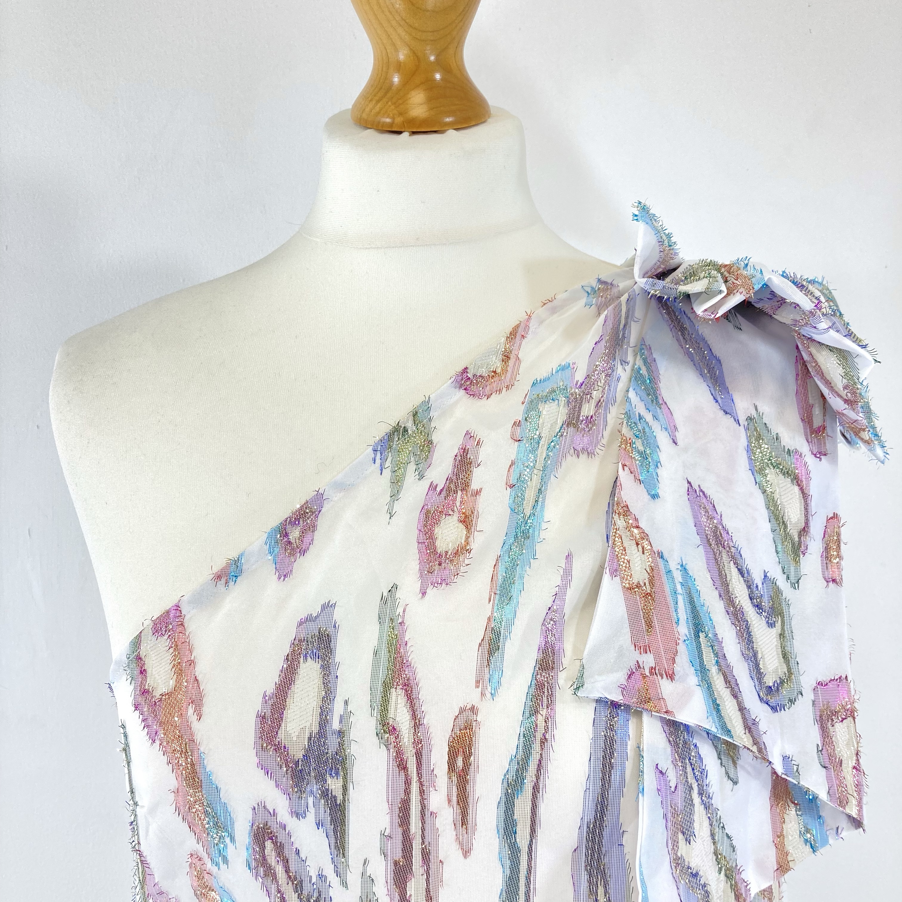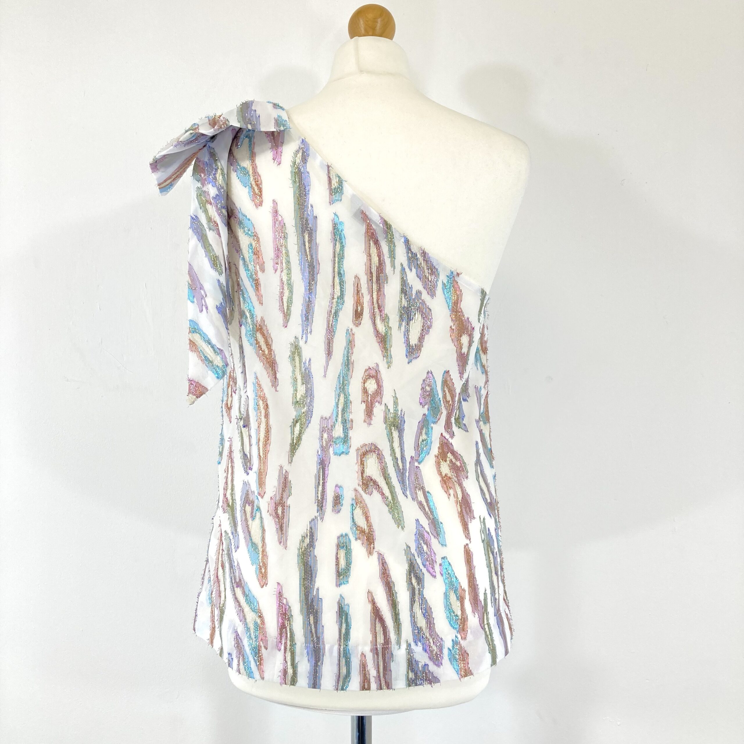 Beautiful one shoulder Top, by Next, in a lightweight White Satin Like Fabric. The Top features a one shoulder design with a large bow on the shoulder that drapes over the front and back. with a multicolour, iridescent animal print.