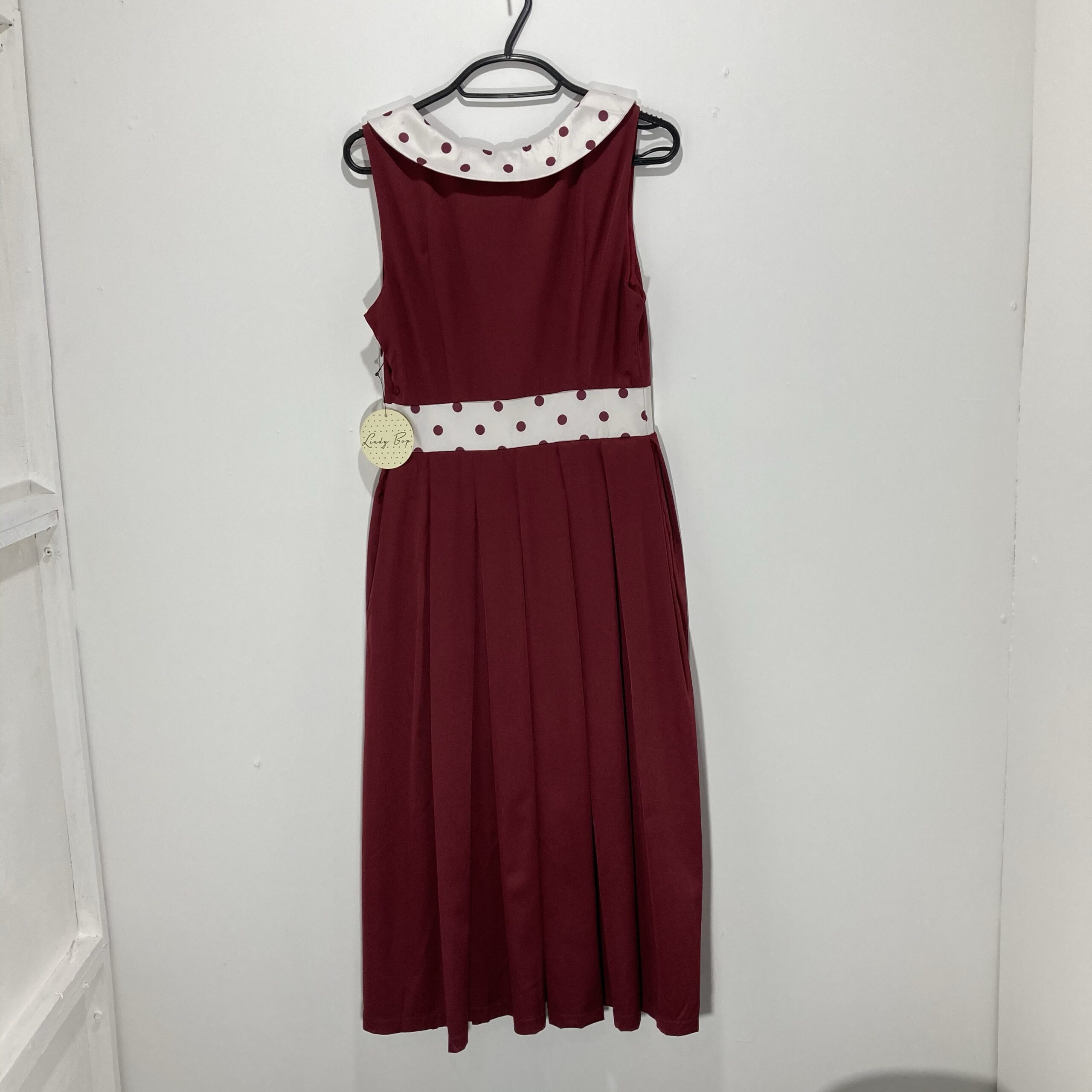 A retro Mod inspired dress by Lindy Bop in a deep maroon fabric. He dress features a polka dotted Peter Pan collar and matching waistband. Fully lined.