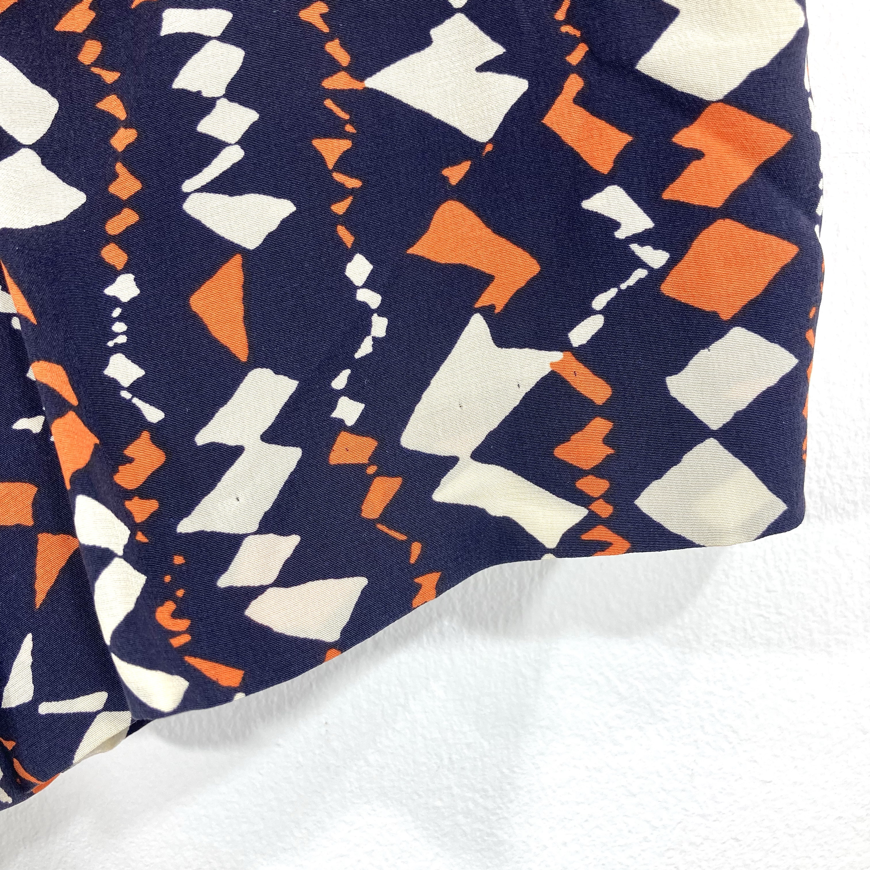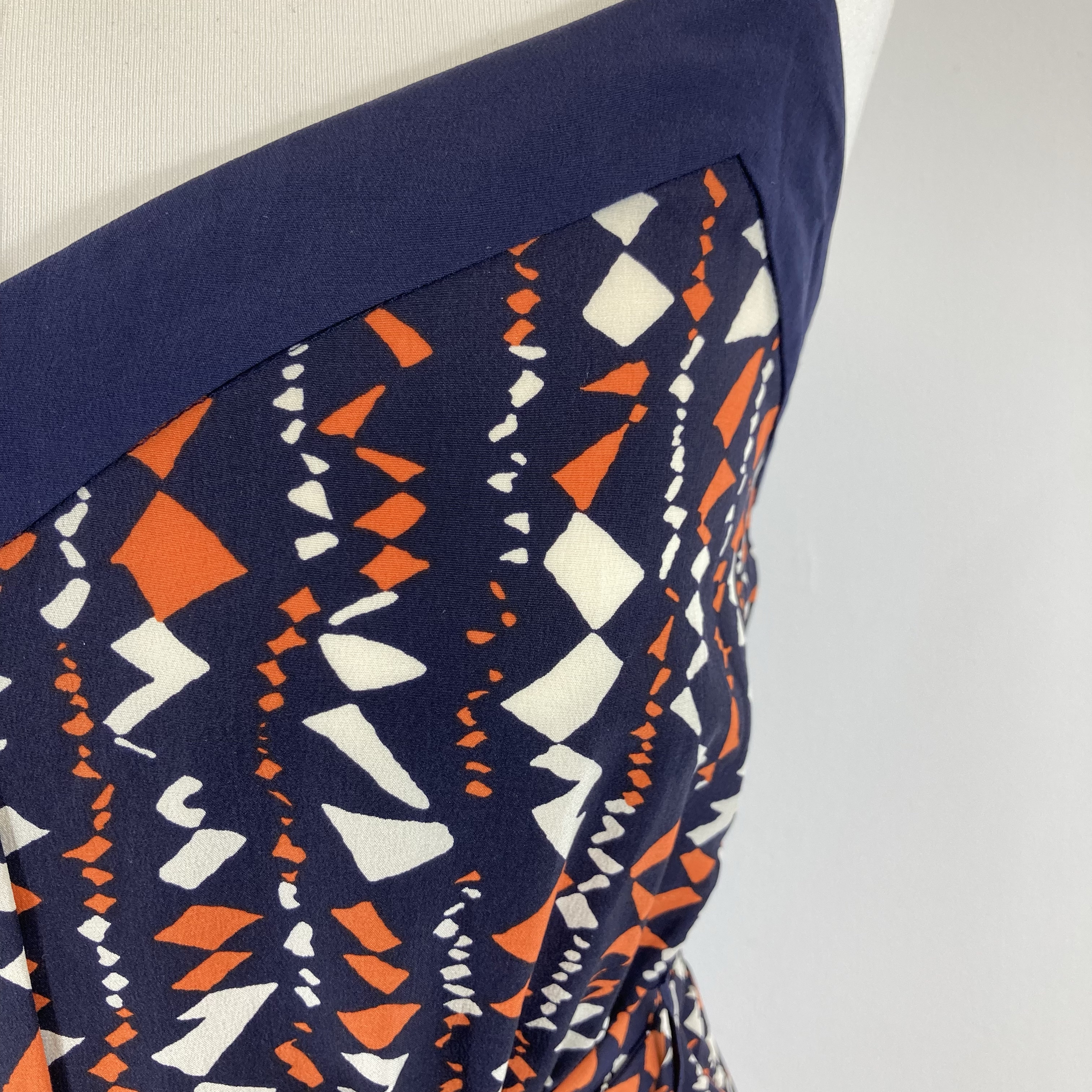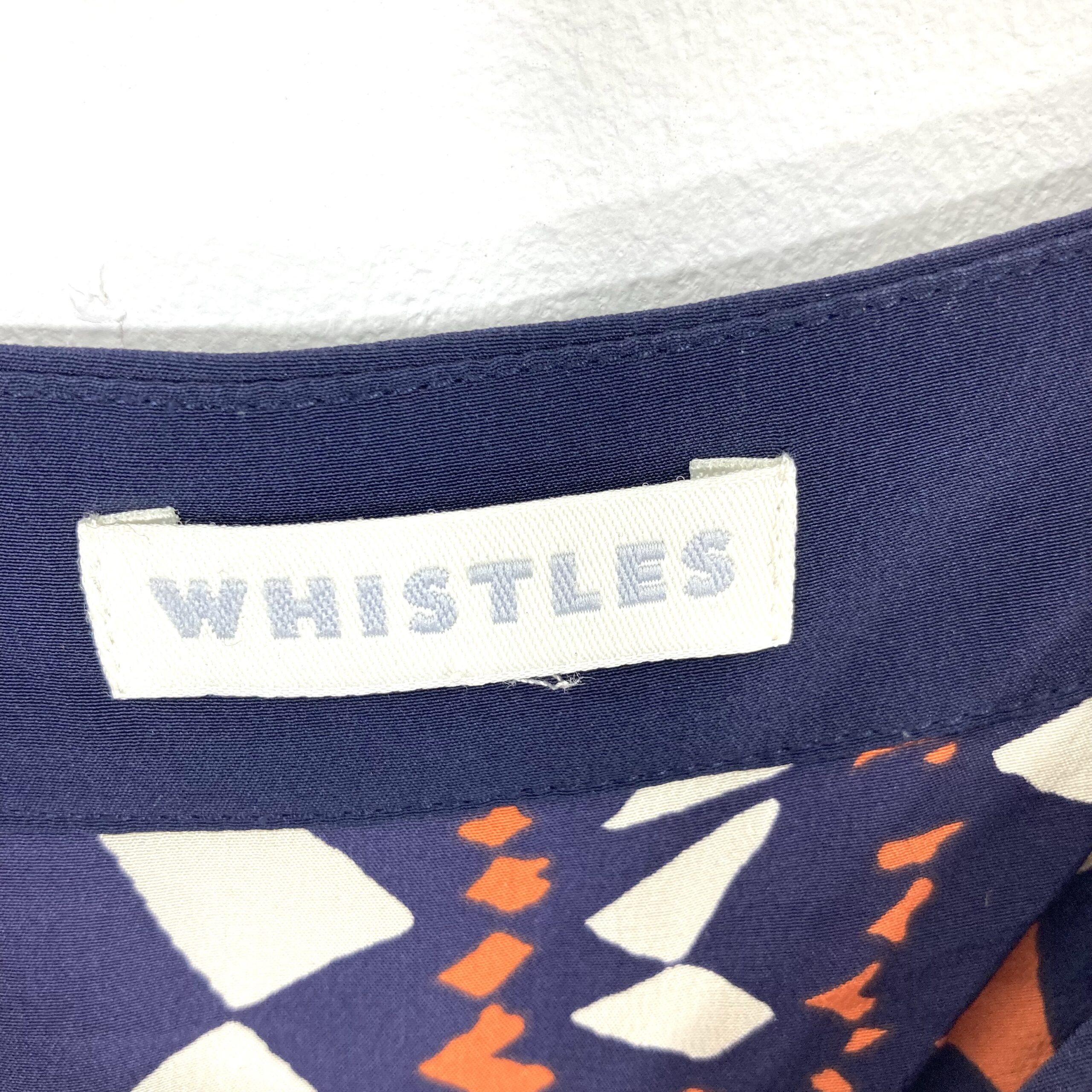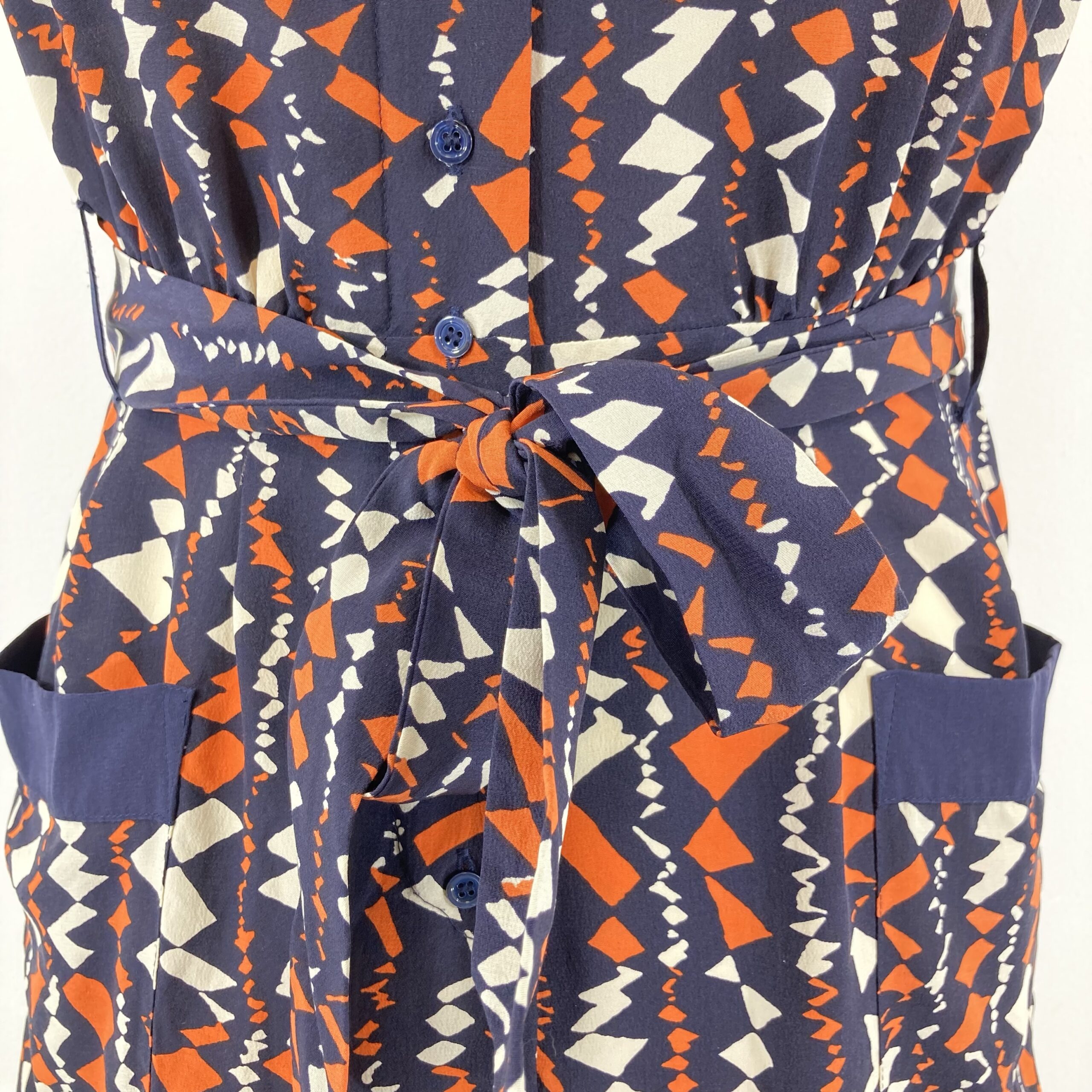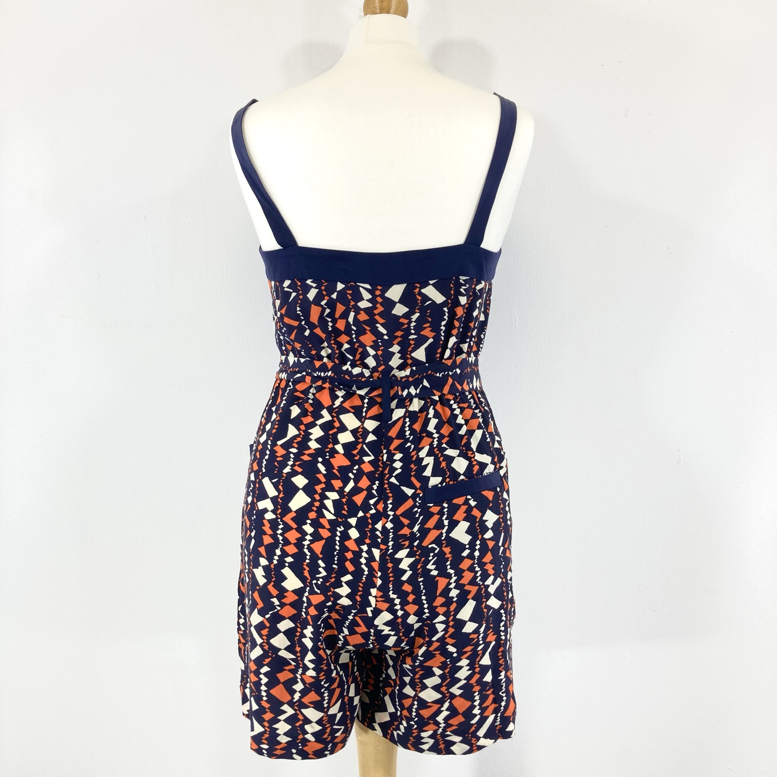 Fun Geometric print playsuit/romper by Whistles in lightweight silk. The suit has a fun geometric print. It has a Rox of buttons on the front and a tie waist.