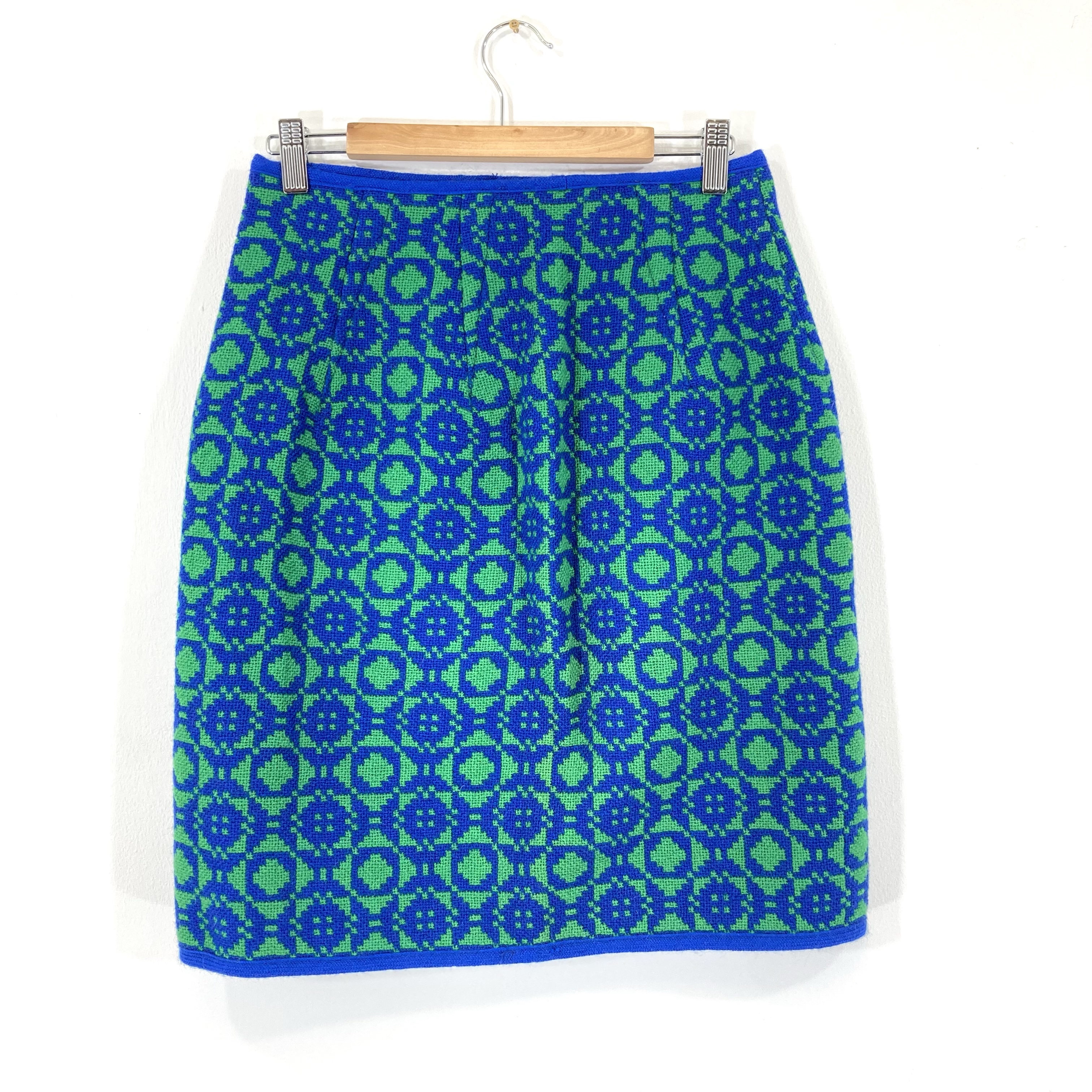 Unusual Knitted wrap skirt by Crefftau in blue and green Wool. The skirt features a wrap design fastening at the hip. Made in wales the skirt is a traditional regional craft design made with welsh wool.