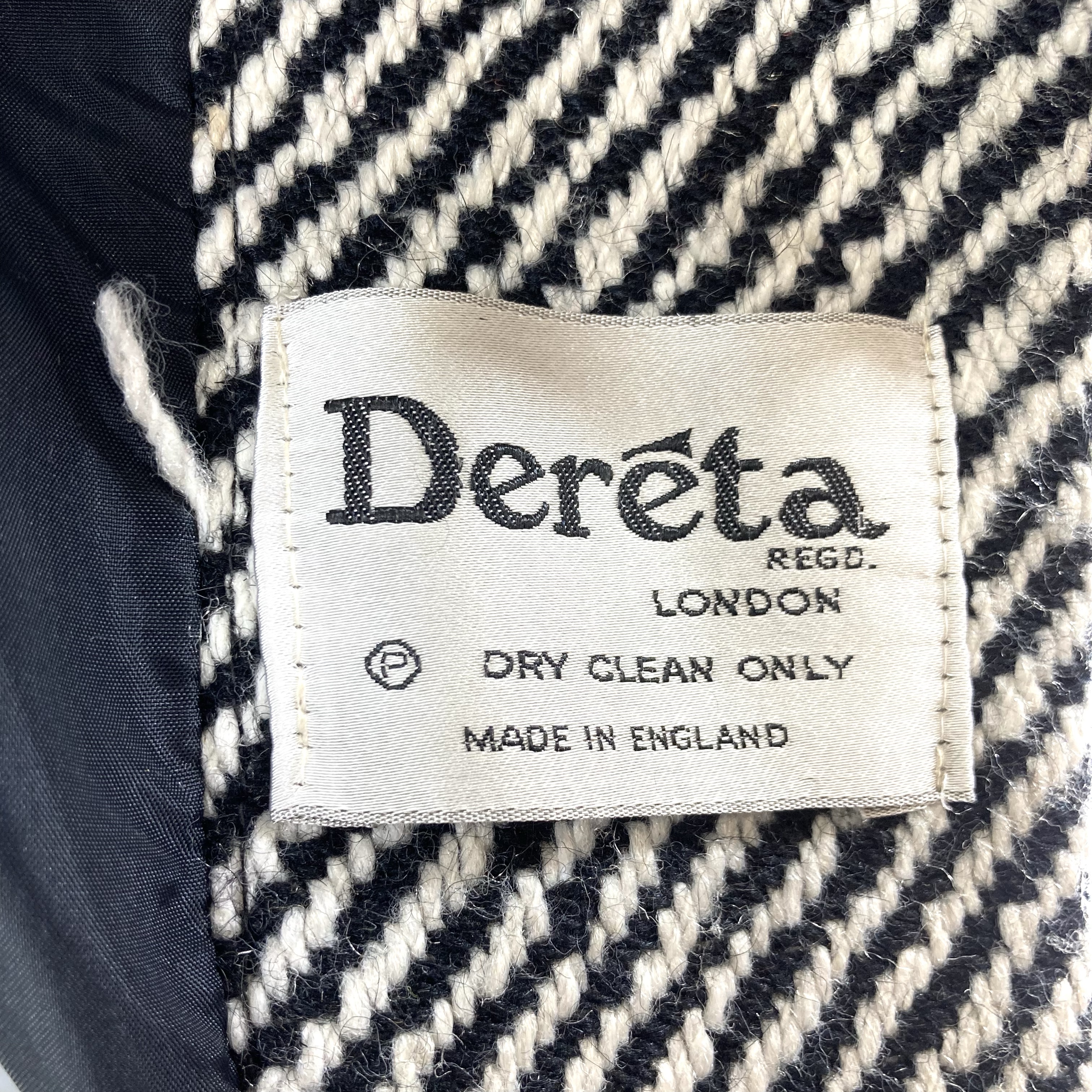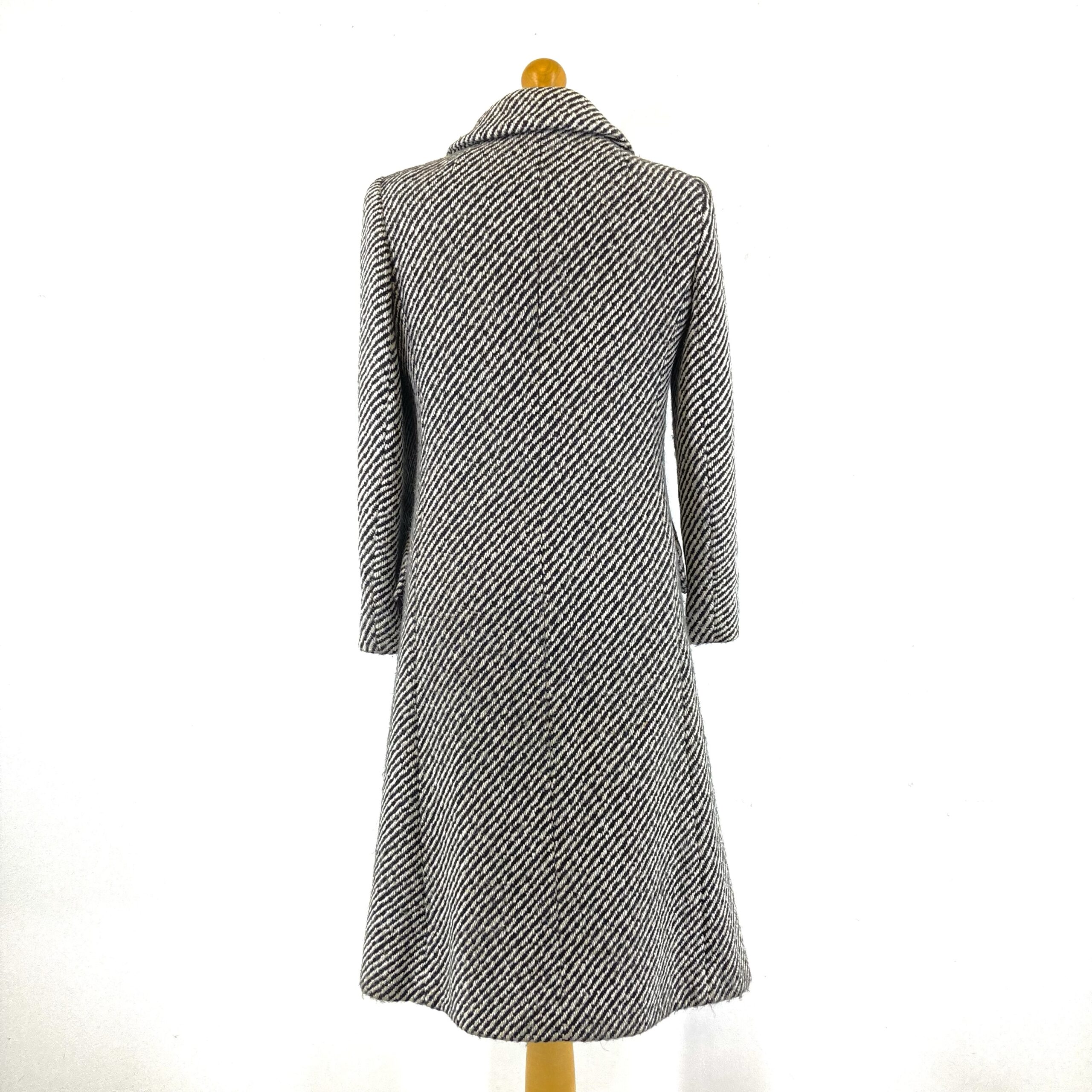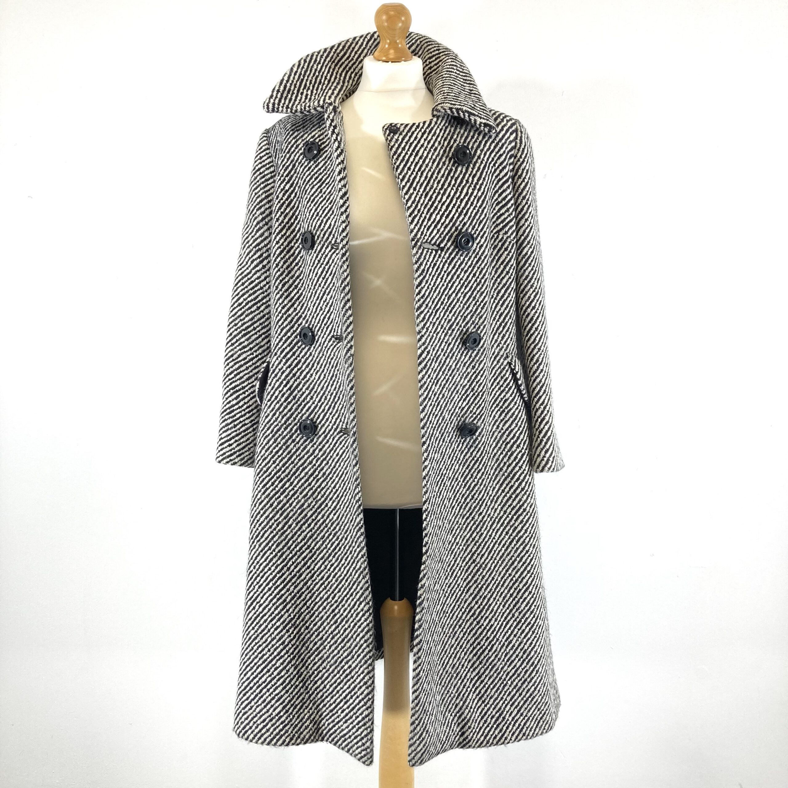 Stunning Vintage Overcoat, by Dereta, in heavyweight black and white wool. The coat features a double breasted design with large buttons. There are hidden press studs at the neck line to help maintain the line on he coat when fully buttoned. Amazing quality.